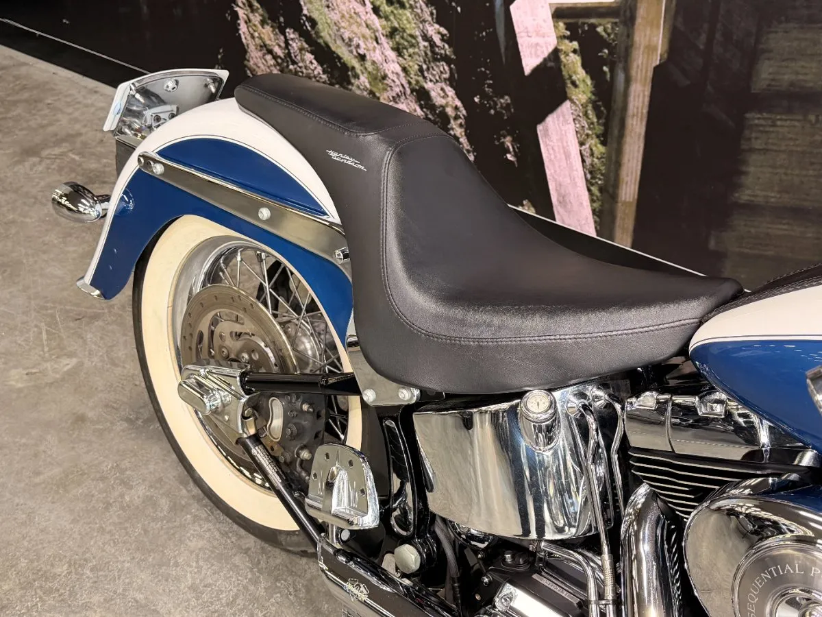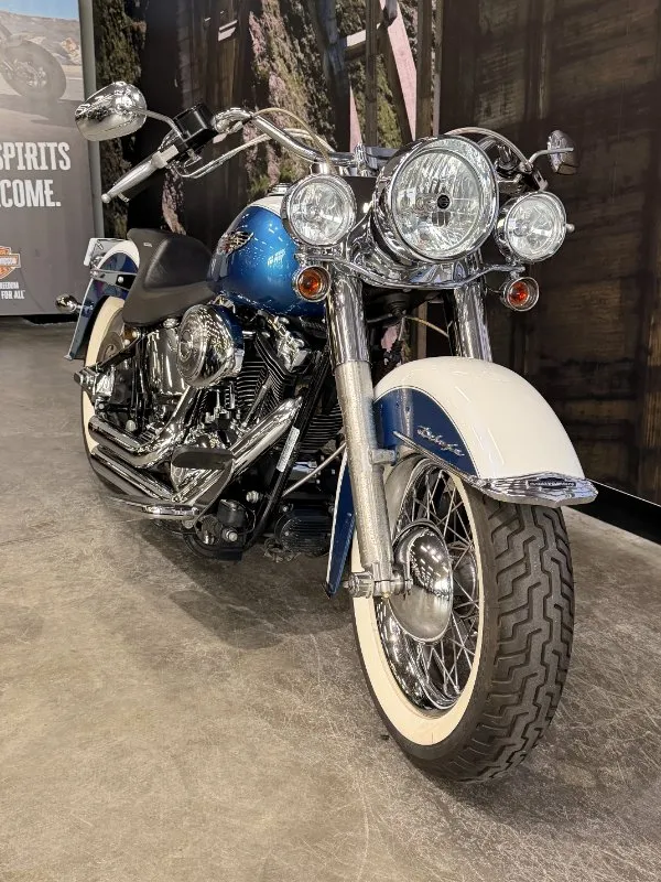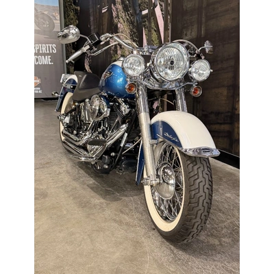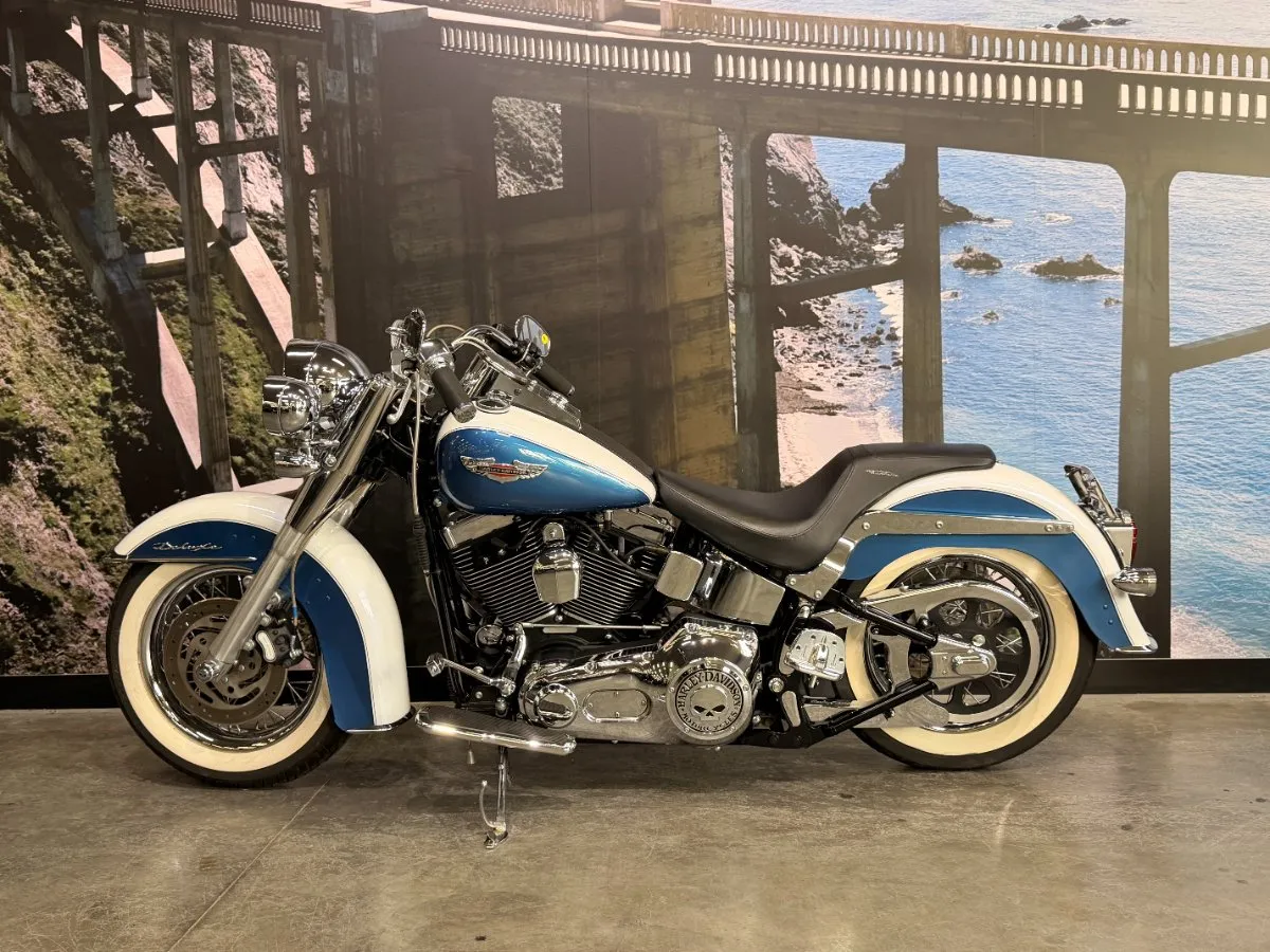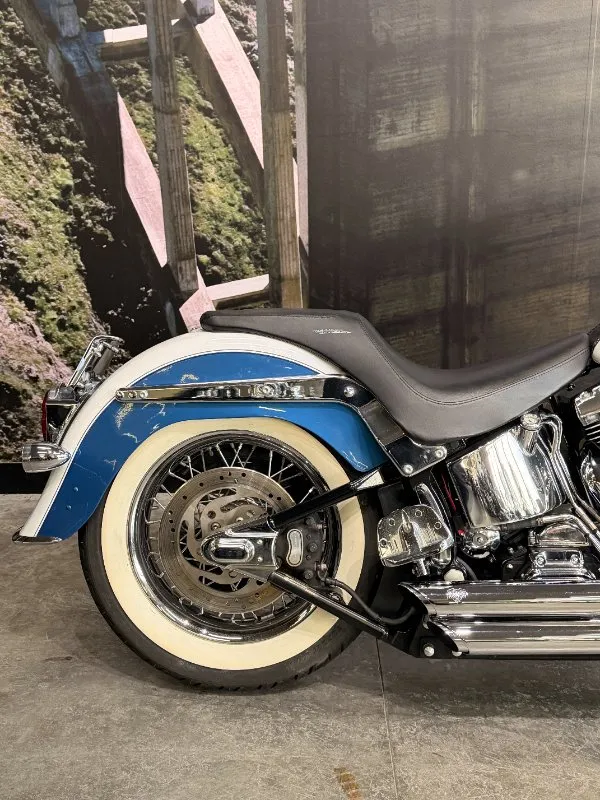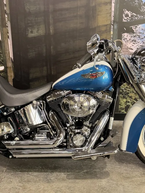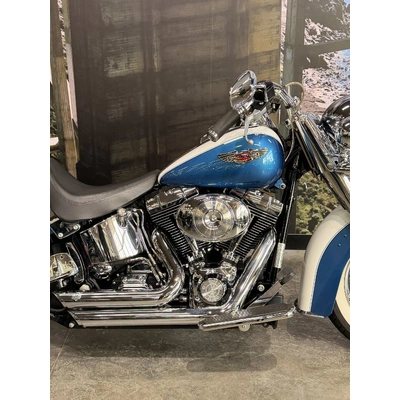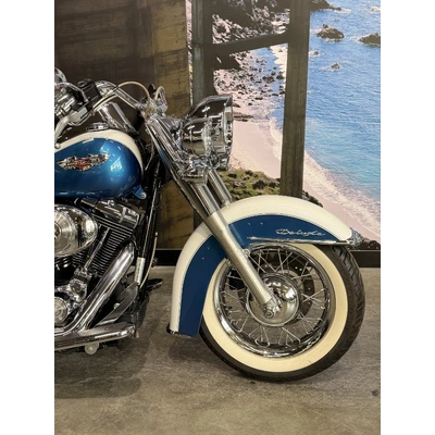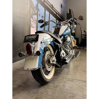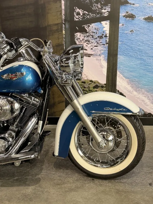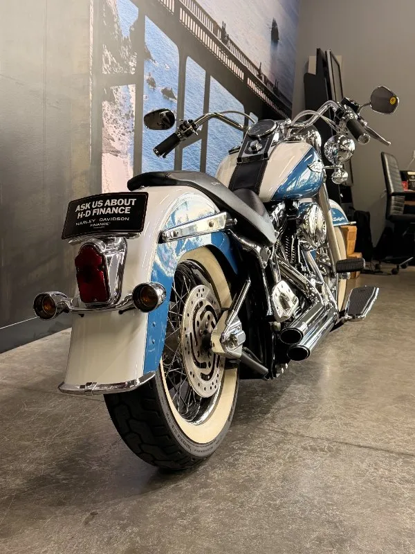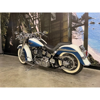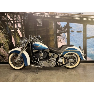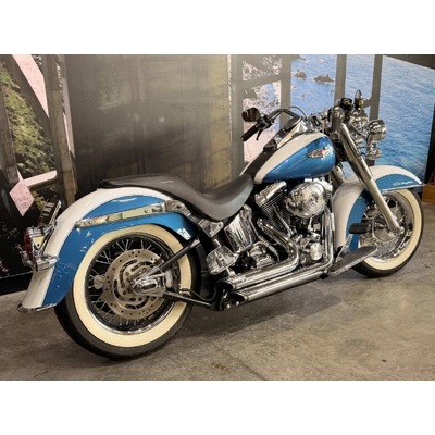 2005 HARLEY-DAVIDSON 1450CC FLSTN SOFTAIL DELUXE FINISHED IN THE BEAUTIFUL FACTORY 2 TONE GLACIER WHITE PEARL & CHOPPER BLUE PEARL PAINT SCHEME!! WHAT AN ABSOLUTE BEAUTY THIS IS!! THE 88 CUBIC ENGINE SOUNDS AWESOME WITH STAGE 2 CAM, VANCE & HINES SHORT SHOT PIPES & A SCREAMIN' EAGLE TUNER!! COMES WITH ALL THE RIGHT JEWELLERY TOO, A SET OF 2010 DELUXE RIMS, HOODED HEADLIGHT LENSES & A TOMBSTONE TAILLIGHT WITH CHROME LAYOWN PLATE FOR THAT CLEAN & CLASSIC LOOK!! A 2005 MODEL WITH ONLY 22,000KMS ON IT THIS IS READY TO BE RIDDEN!! COME IN TODAY & CHECK OUT THIS CLASSIC LOOKING DELUXE BEFORE IT'S GONE.