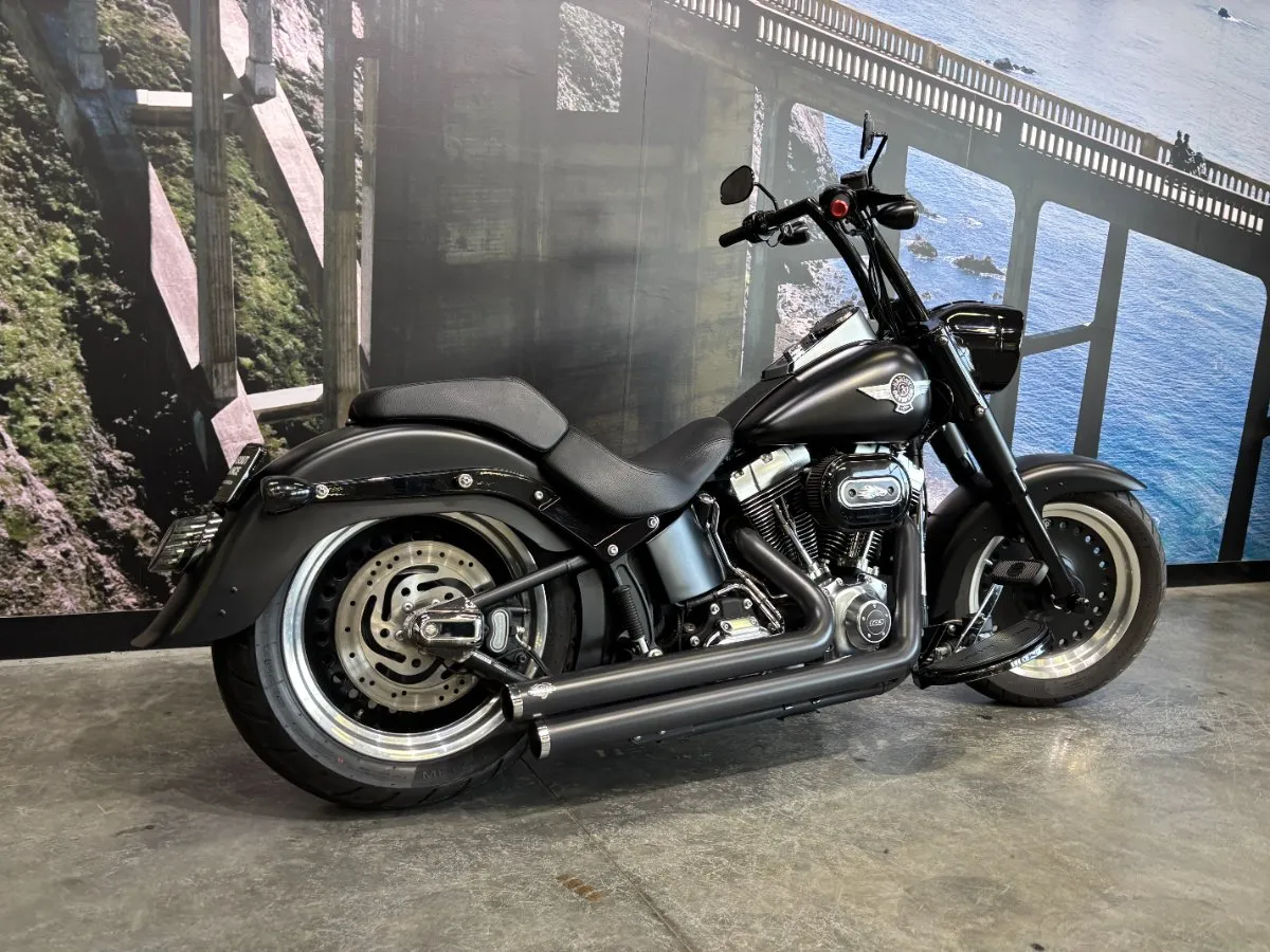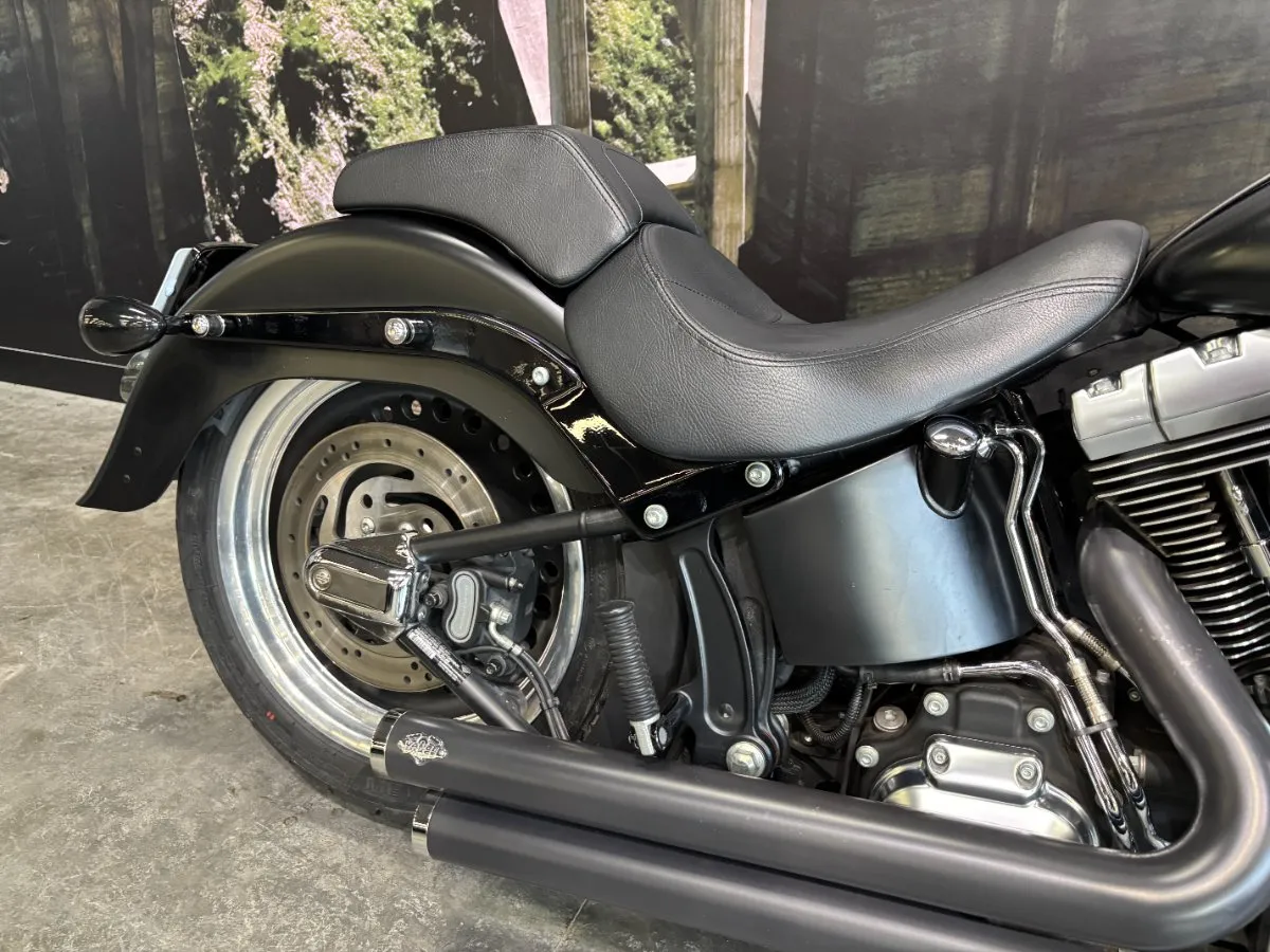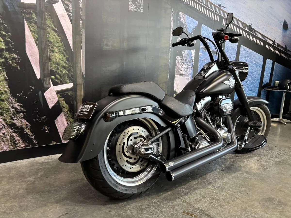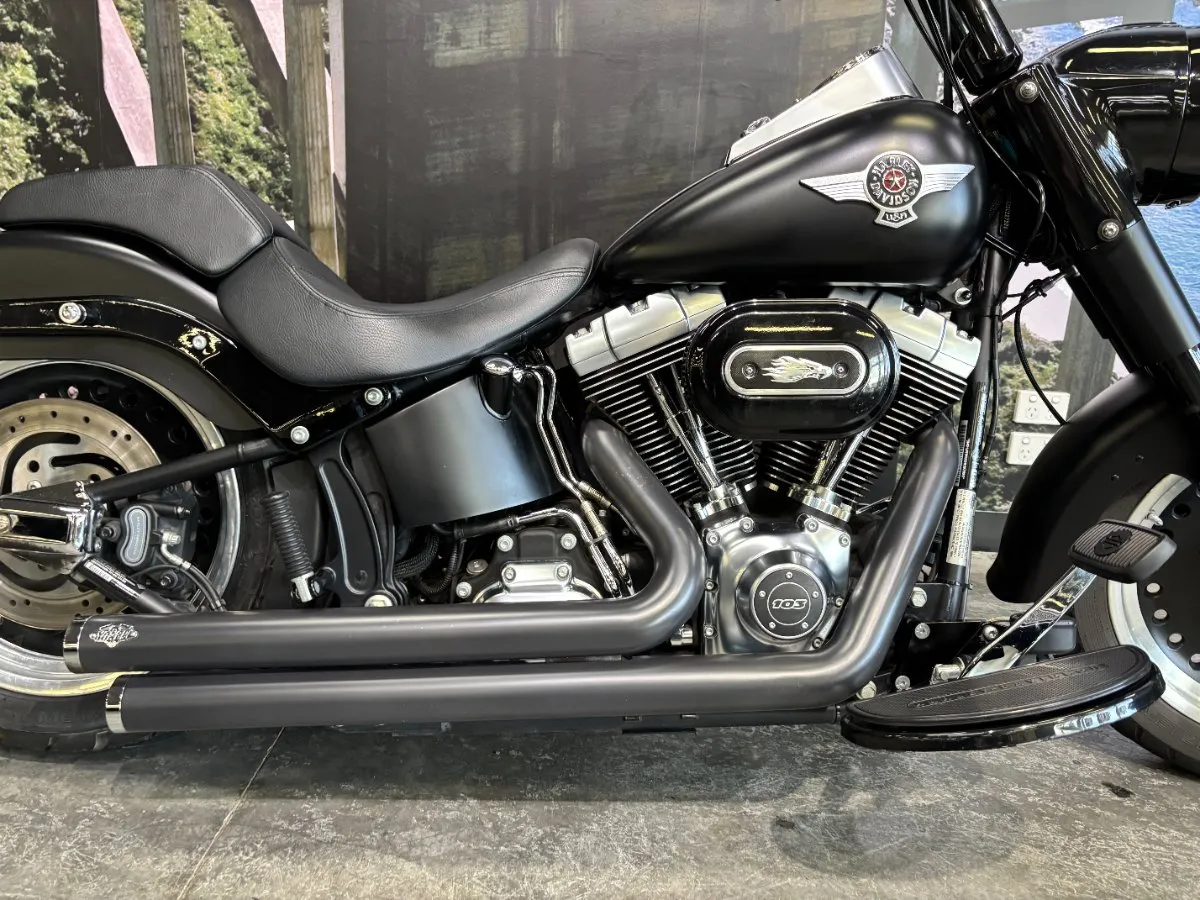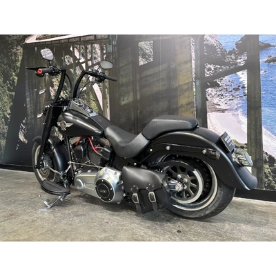 2013 HARLEY-DAVIDSON 1700CC FLSTFB FAT BOY LO FINISHED IN HARLEY-DAVIDSON DENIM BLACK PAINT & ALLOY TRIM, WHAT AN INCREDIBLE COMBINATION!! THE 103 ENGINE IS COMPLIMENTED WITH A SET OF VANCE & HINES BLACK BIG SHOTS STAGGERED PIPES & SCREAMIN EAGLE AIR INTAKE, THIS BLACK BEAUTY SOUNDS CRAZY!! 14 INCH BURLEIGH BARS, LED HEADLIGHT, BLACKED OUT FORKS & CONTROLS ALONG WITH A LAY DOWN PLATE ON THE REAR GIVES THIS FAT BOY LO LOOKS UNREAL!! THIS BAD BOY ALSO COMES WITH REAR AIR RIDE, GET READY TO TURN HEADS WITH THIS AWESOME FAT BOY LO!!