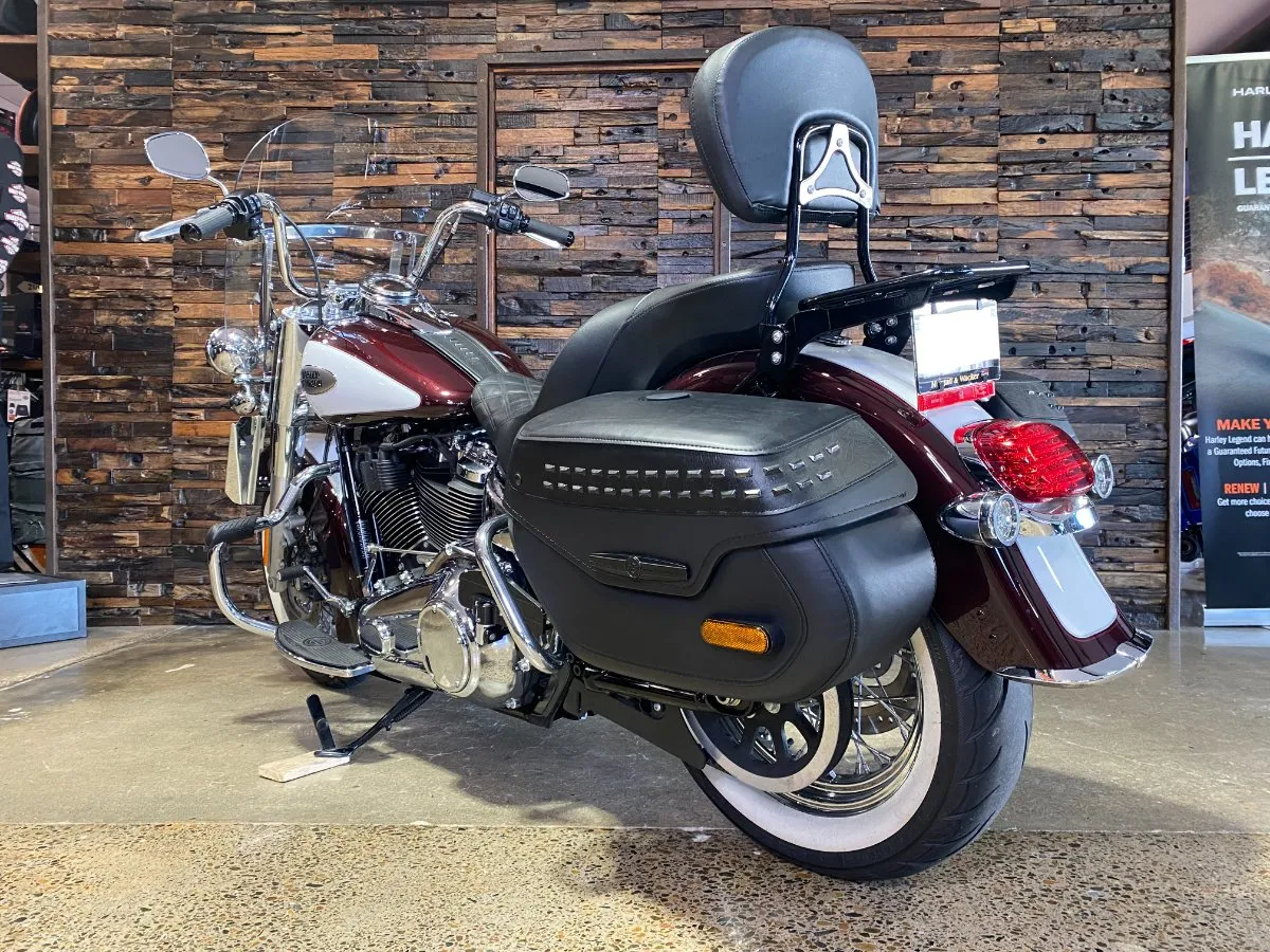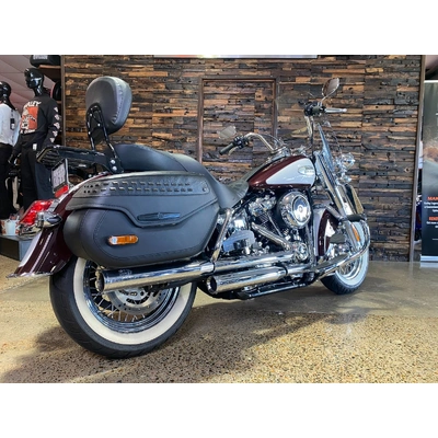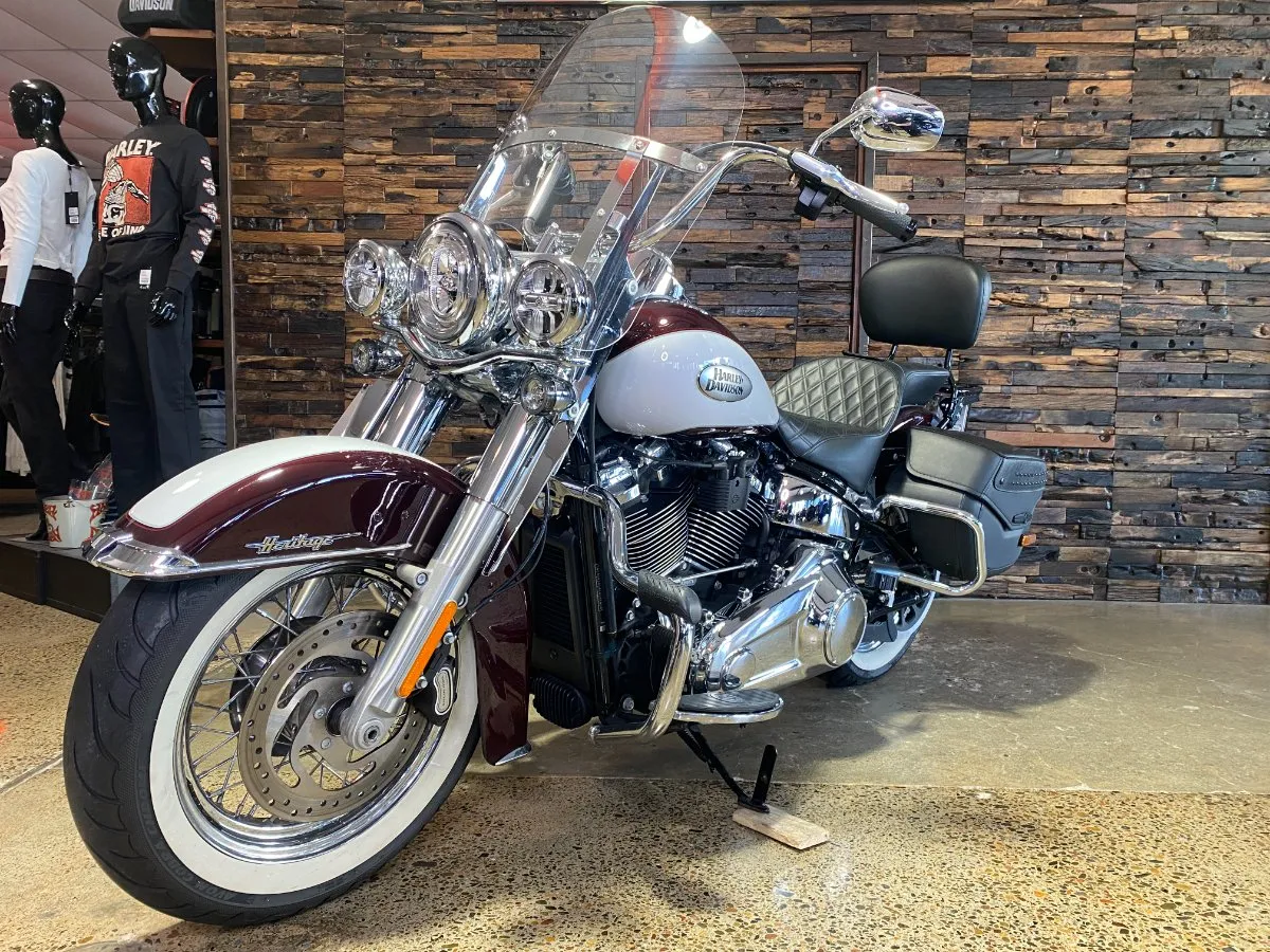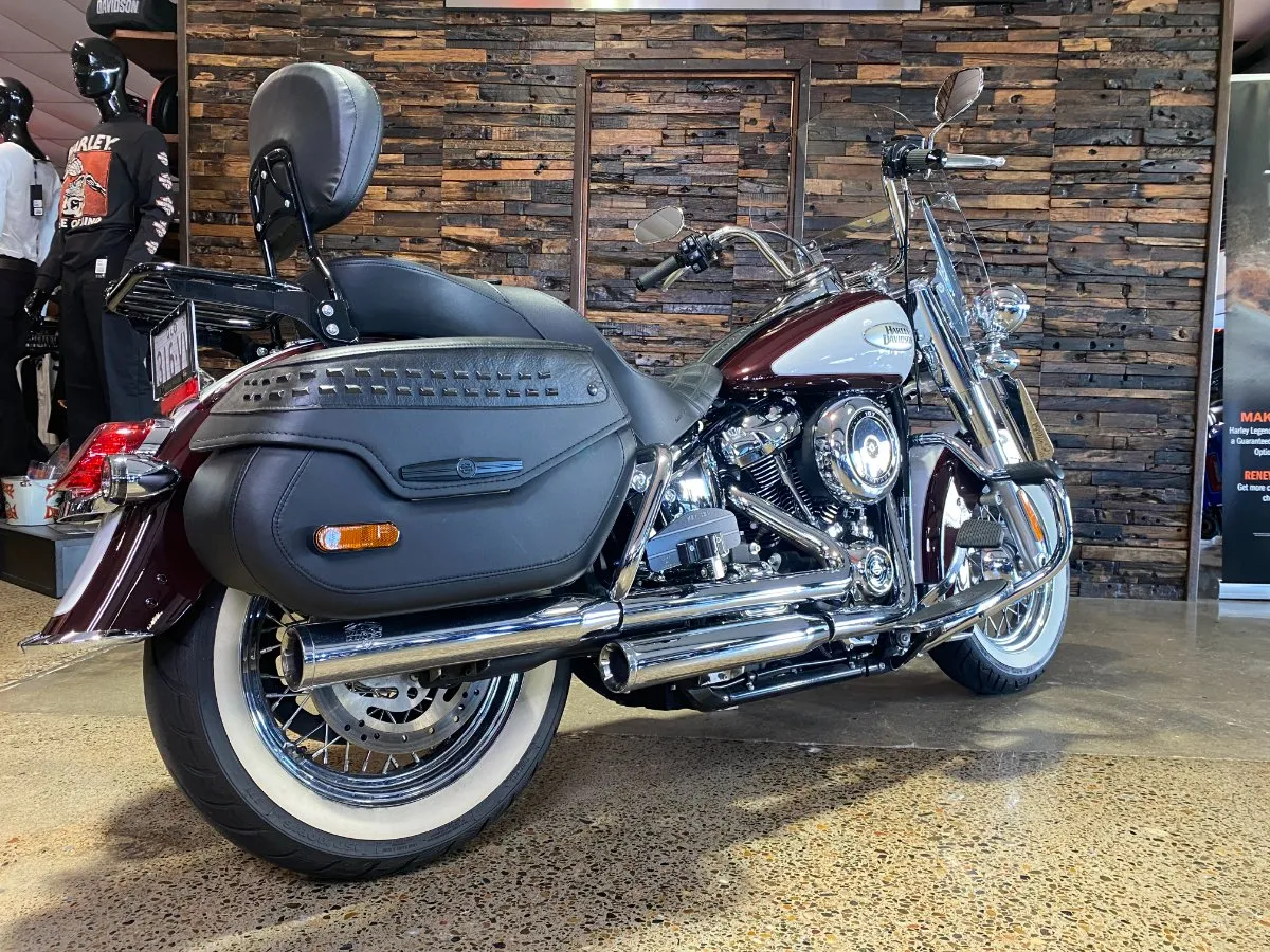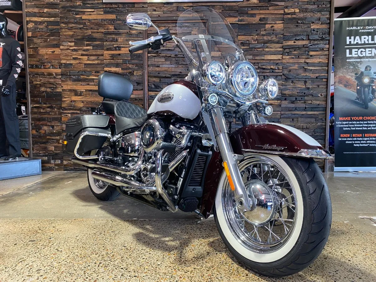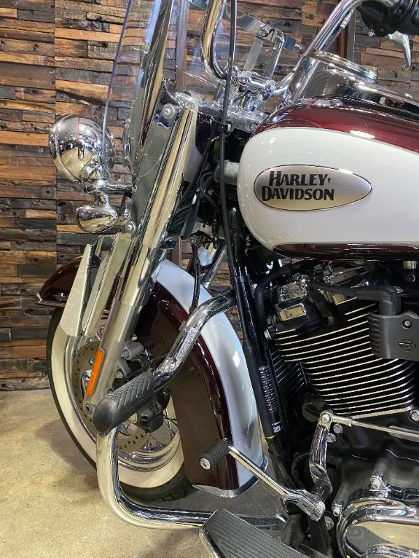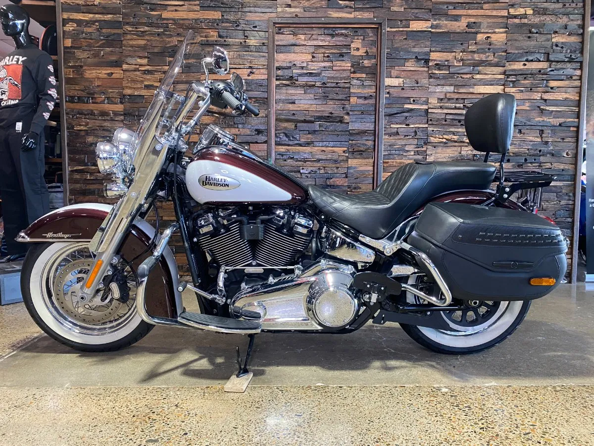 Turn heads and ride in timeless Harley style with this beautifully presented Heritage Classic. Finished in the stunning two-tone Midnight Crimson and Stone Wash White with gleaming chrome trim, this bike blends old-school nostalgia with modern performance