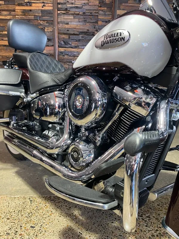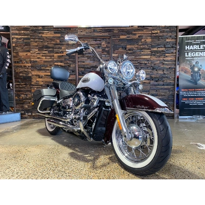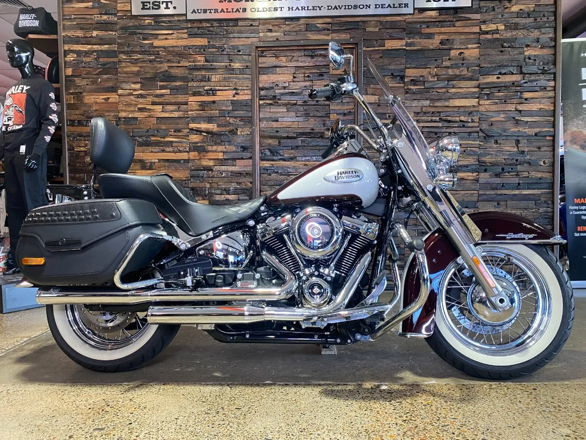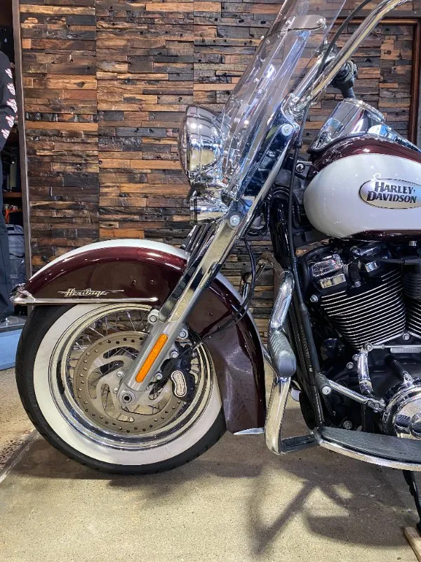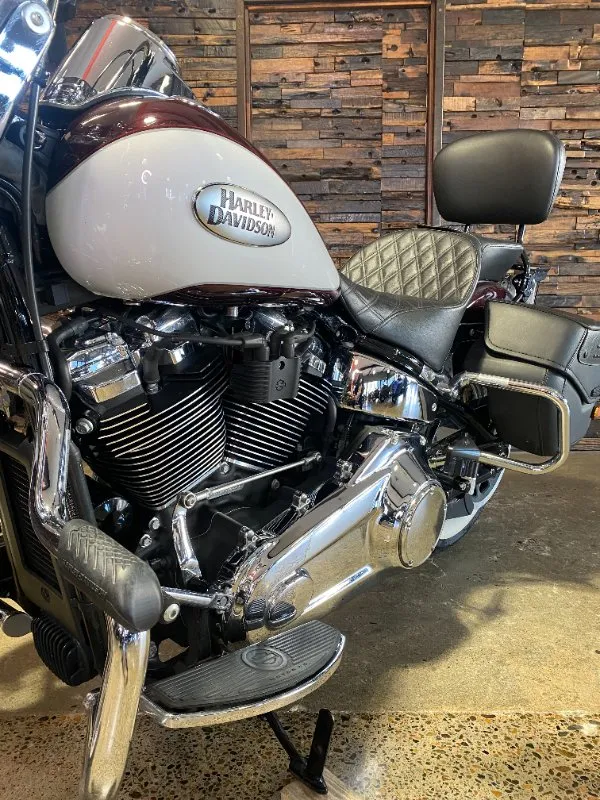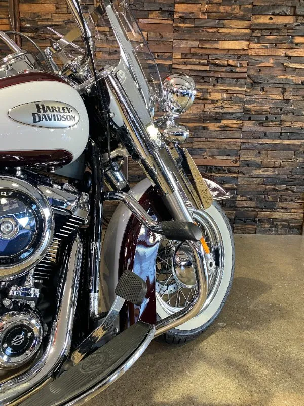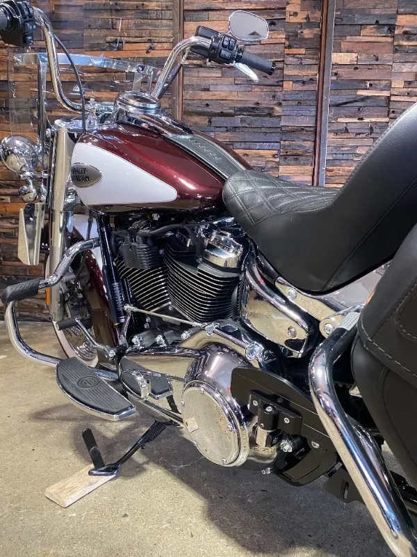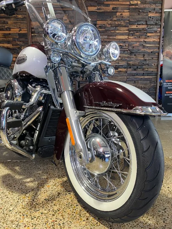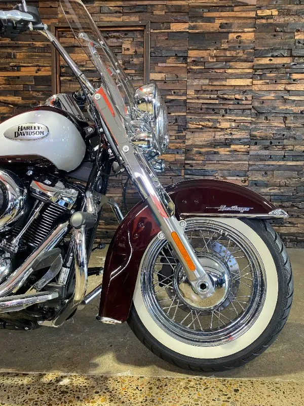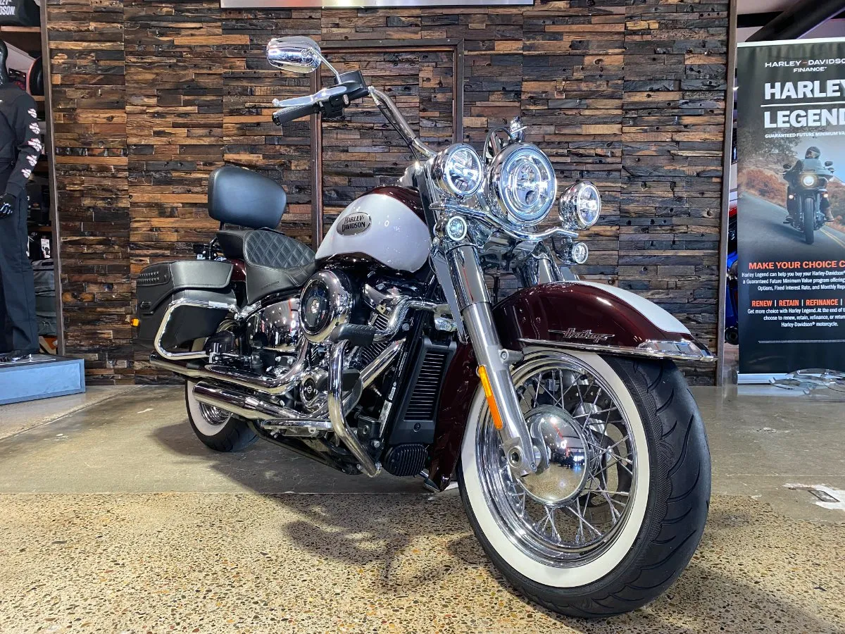 Turn heads and ride in timeless Harley style with this beautifully presented Heritage Classic. Finished in the stunning two-tone Midnight Crimson and Stone Wash White with gleaming chrome trim, this bike blends old-school nostalgia with modern performance