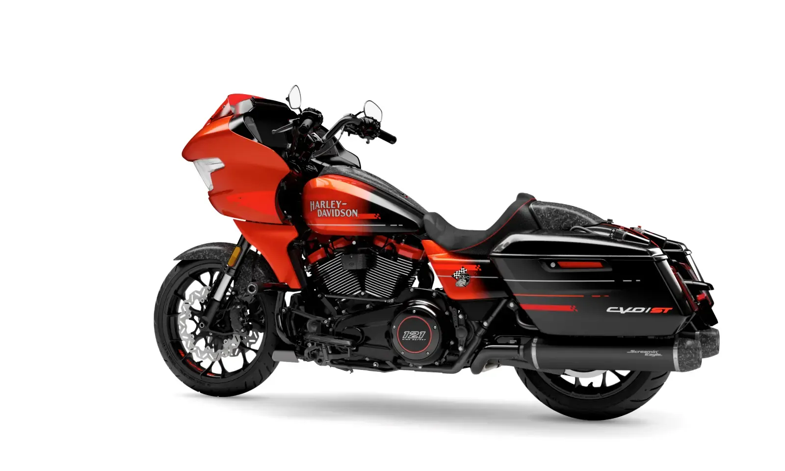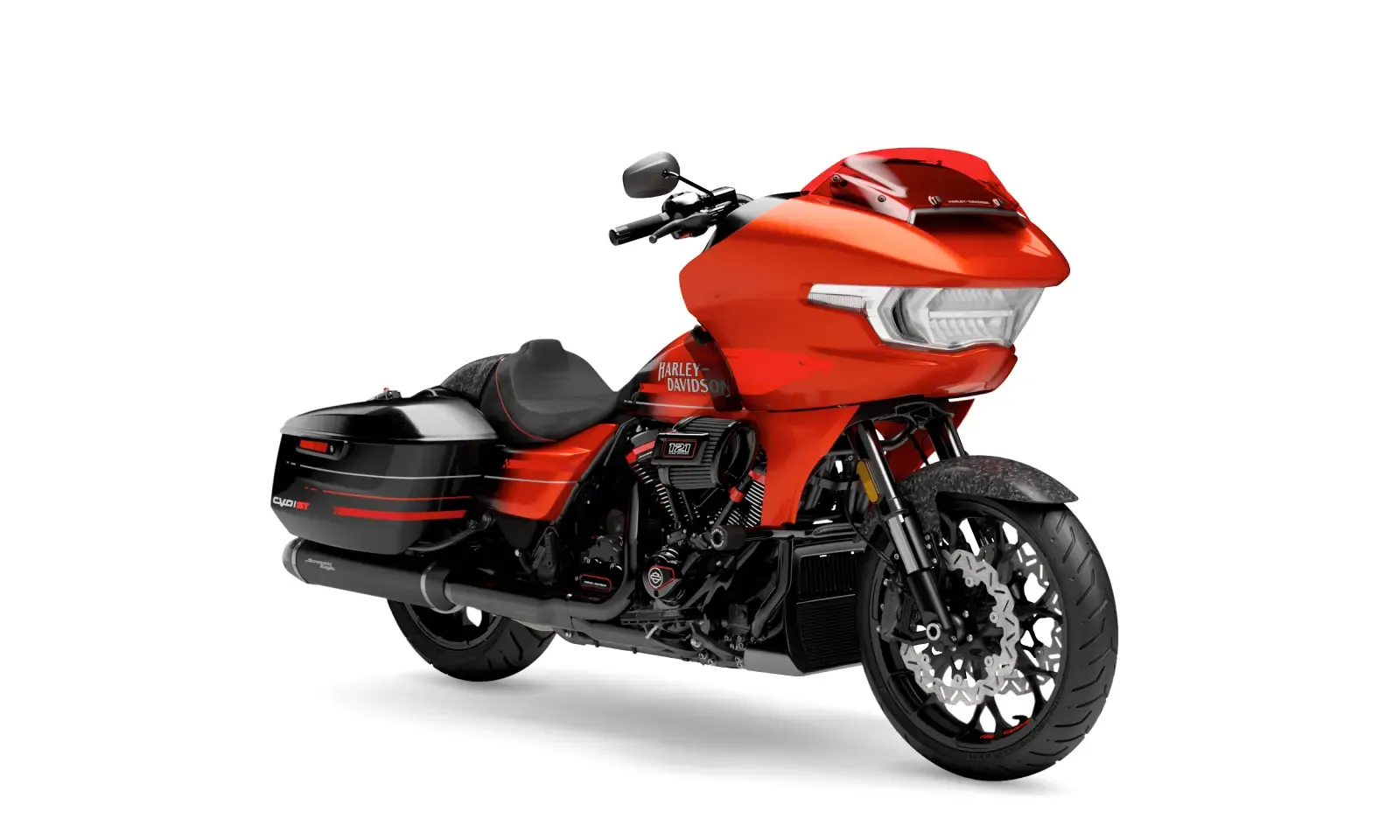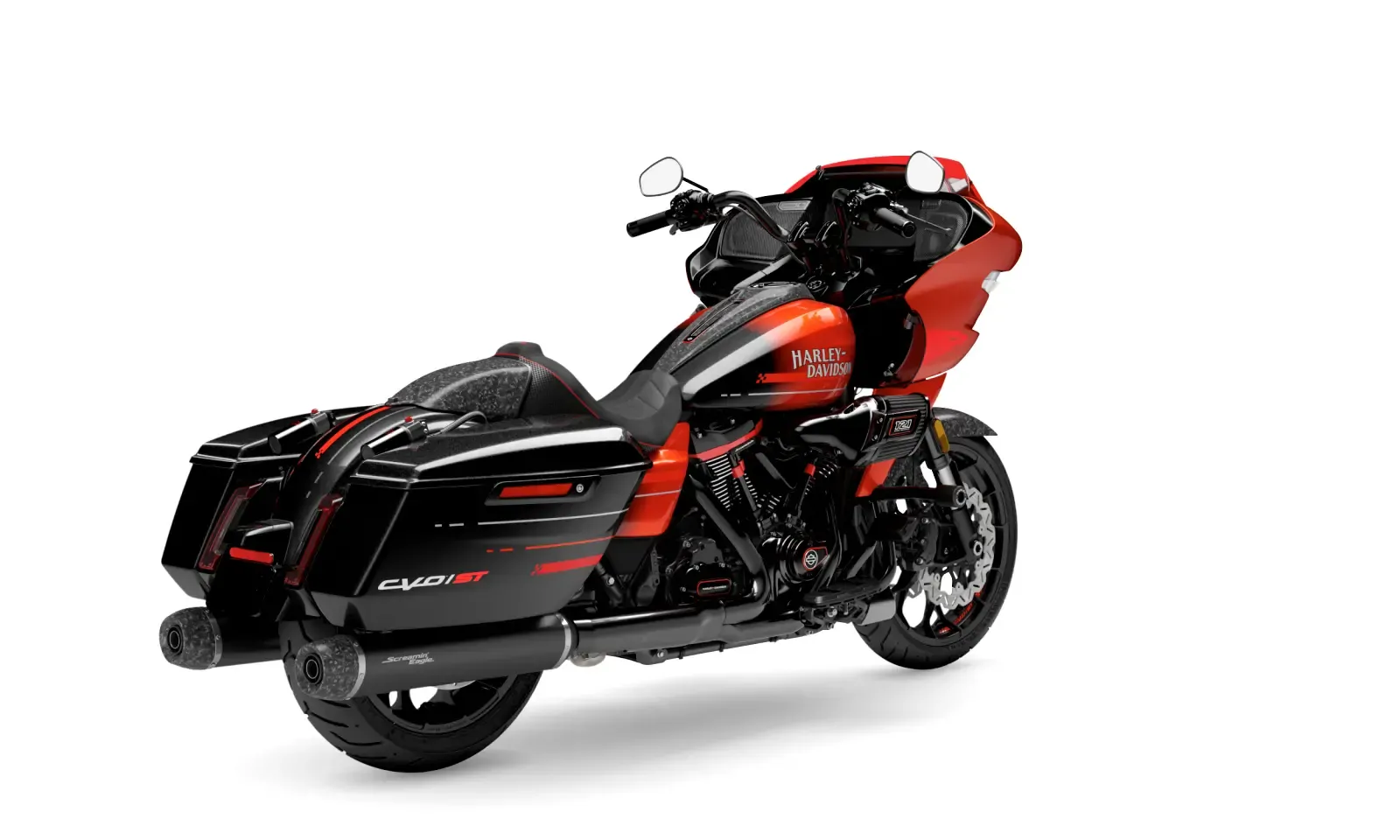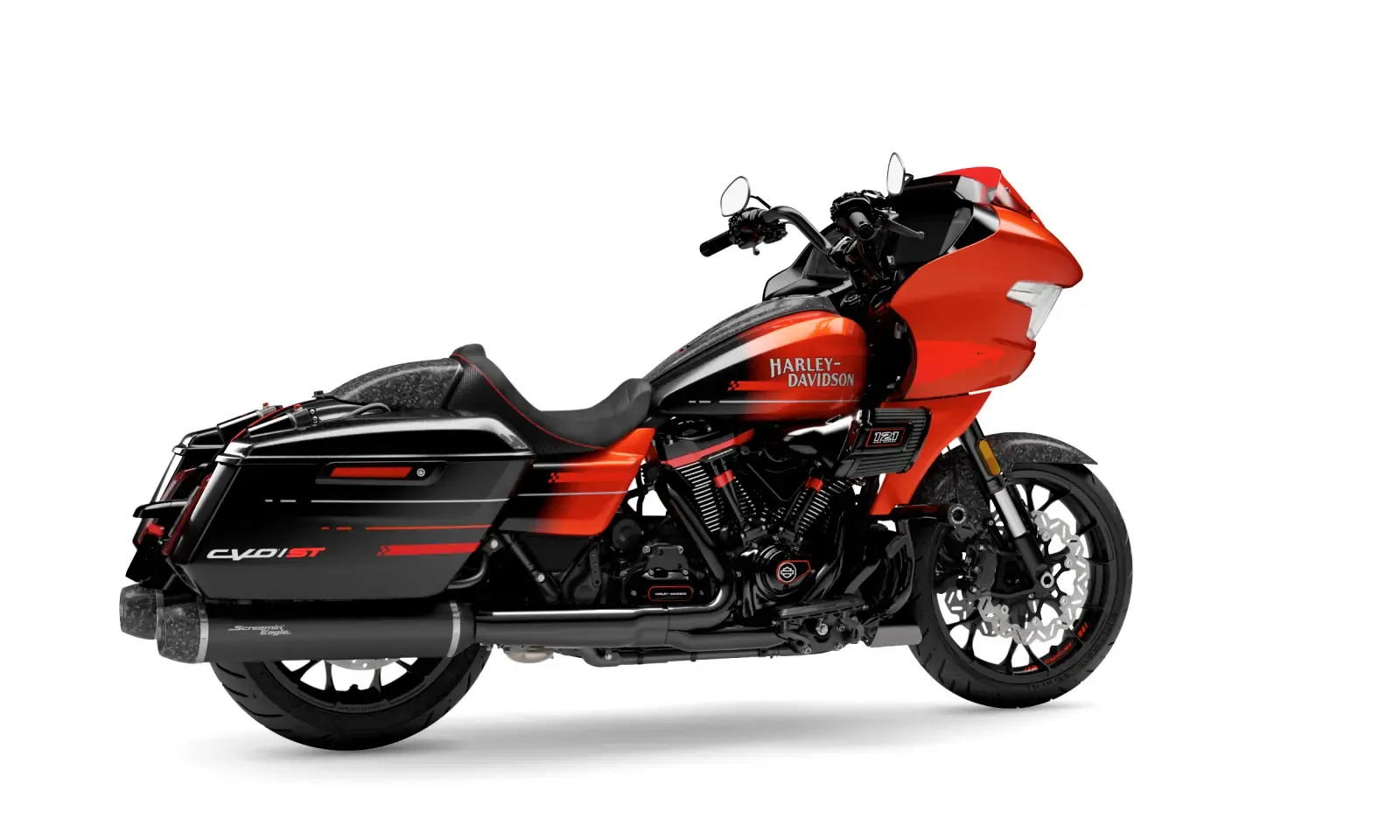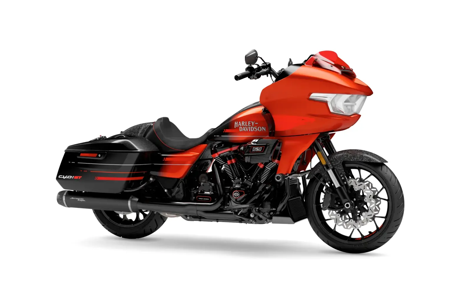 Available in three exclusive colorways Citrus Heat Re-Entry, Inferno Gray, and Electric Coast each one amplifies the CVO Road Glide STs race-inspired attitude. Citrus Heat Re-Entry, available only on this model, features a bold Screamin Eagle graphic across the fairing and tank, while Inferno Gray and Electric Coast showcase Harley-Davidson script and an oversized Bar & Shield. This bike looks every bit as fierce as it sounds.