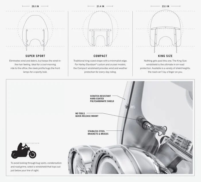 Designed to be installed or removed without tools in seconds, a detachable windshield gives you the freedom to define your ride at the drop of a hat. Ride across the country protected from the elements, then quickly remove the windshield to hit the streets in style.