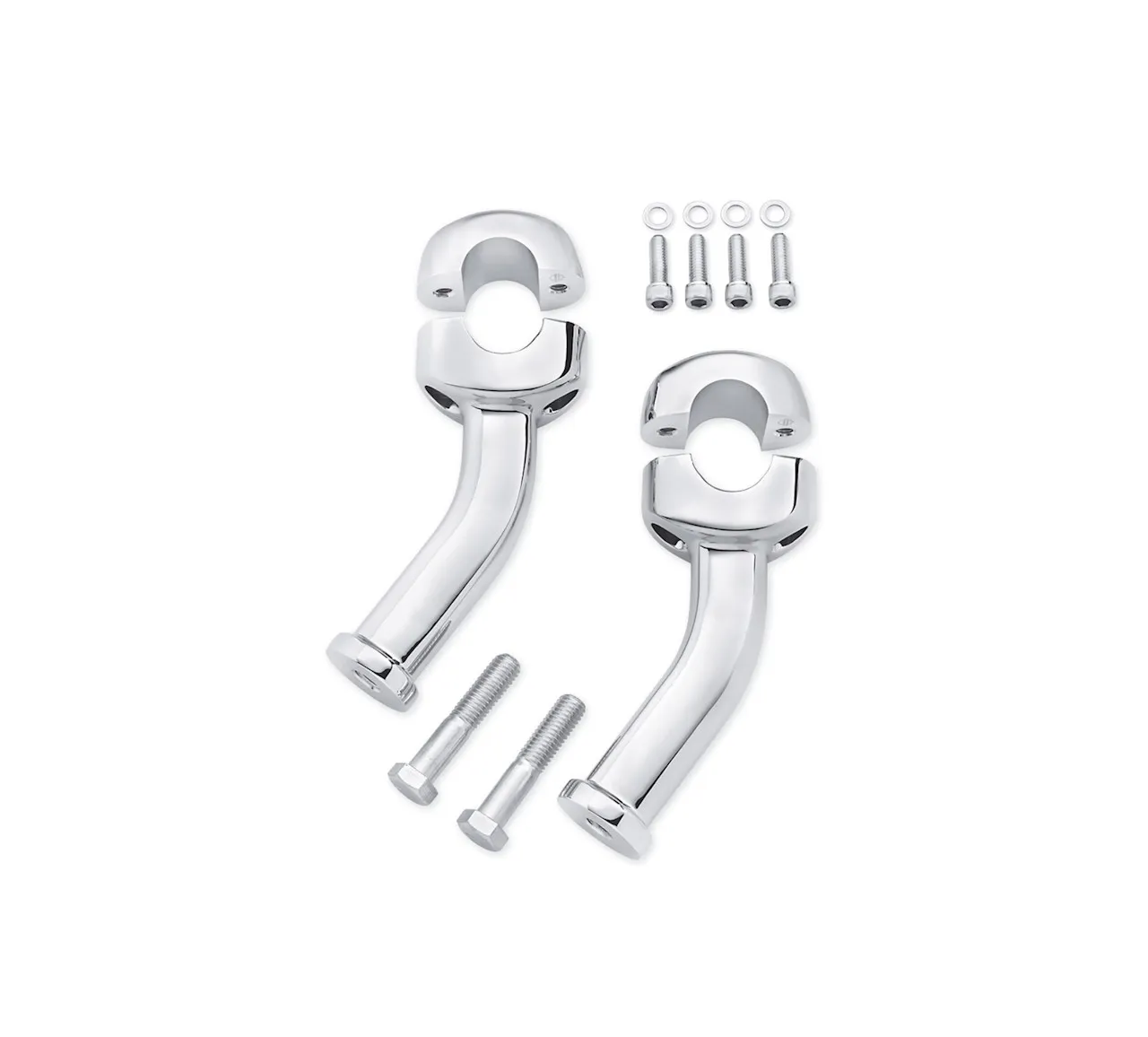 These chrome-plated Curved Pullback Risers provide a comfortable riding position for those who like the shape, width, and hand position of their current handlebar, but wish it was a closer. For an ergonomically-friendly ride, these risers can be combined with a Harley-Davidson™ Reduced Reach seat and Profile Low suspension components to reduce arm stretch and to plant the feet firmly on the ground.