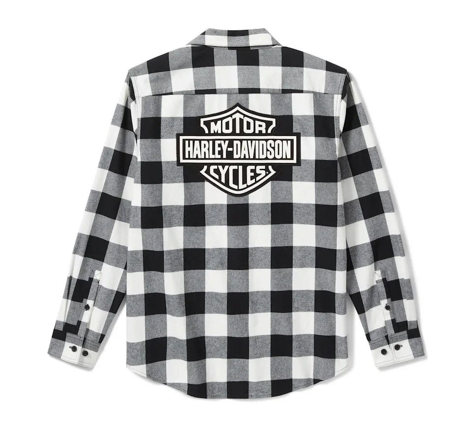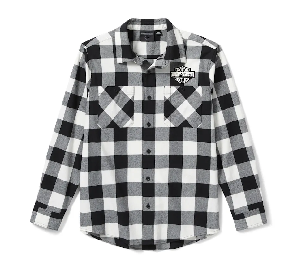 Cozy, classic style is all yours in the Bar & Shield Buffalo Check Flannel. It’s made for longwearing comfort from brushed cotton twill that’s washed for softness. This men’s long sleeve button down shirt features a shirttail hem that looks great tucked in or out, a handy pen stall on the left chest pocket, and a hidden snap-down collar that won’t flap around under riding gear. It’s an ideal pick to wear as is, or open over your favorite H-D® tee. The bold buffalo check pattern complements the patches of our most notable logo on the front and back.