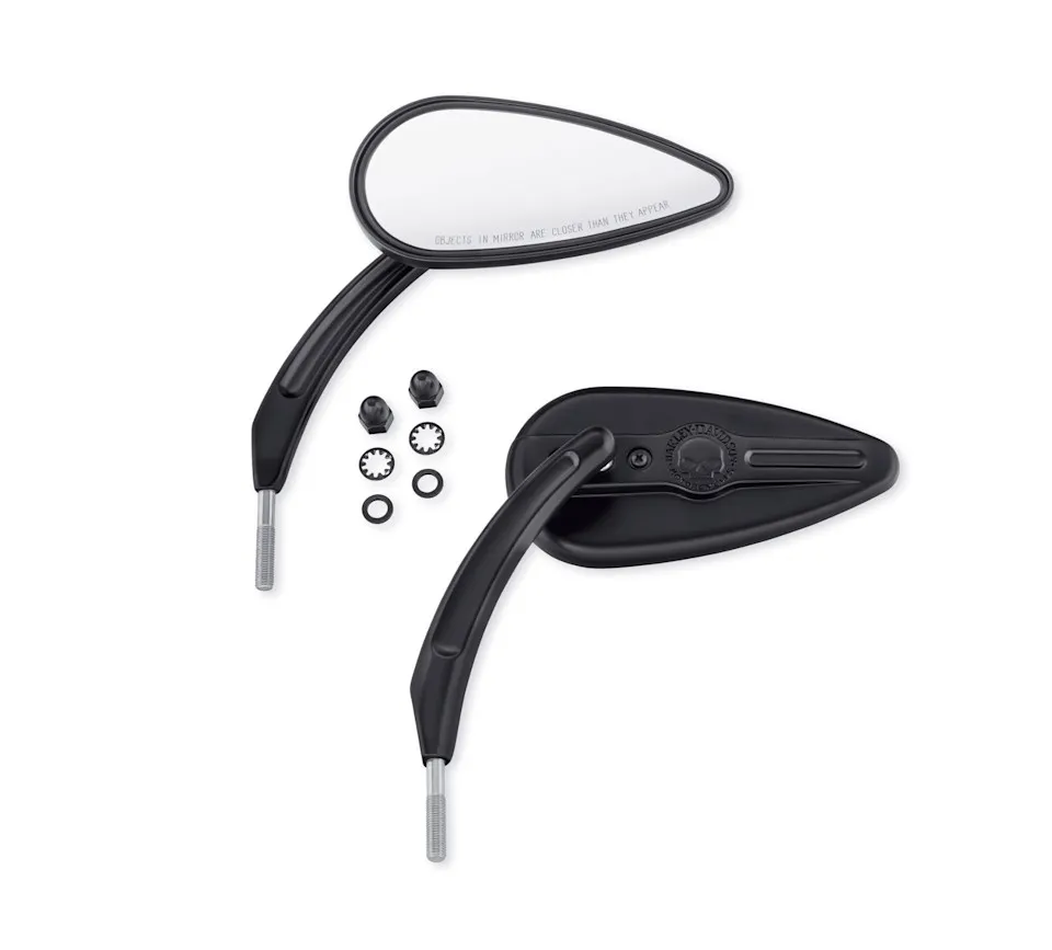 Add a little attitude to your ride. Styled to complement other Willie G Skull Collection Accessories, these teardrop-shaped mirrors feature the Willie G Skull with surrounding Harley-Davidson Motorcycles script.