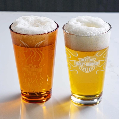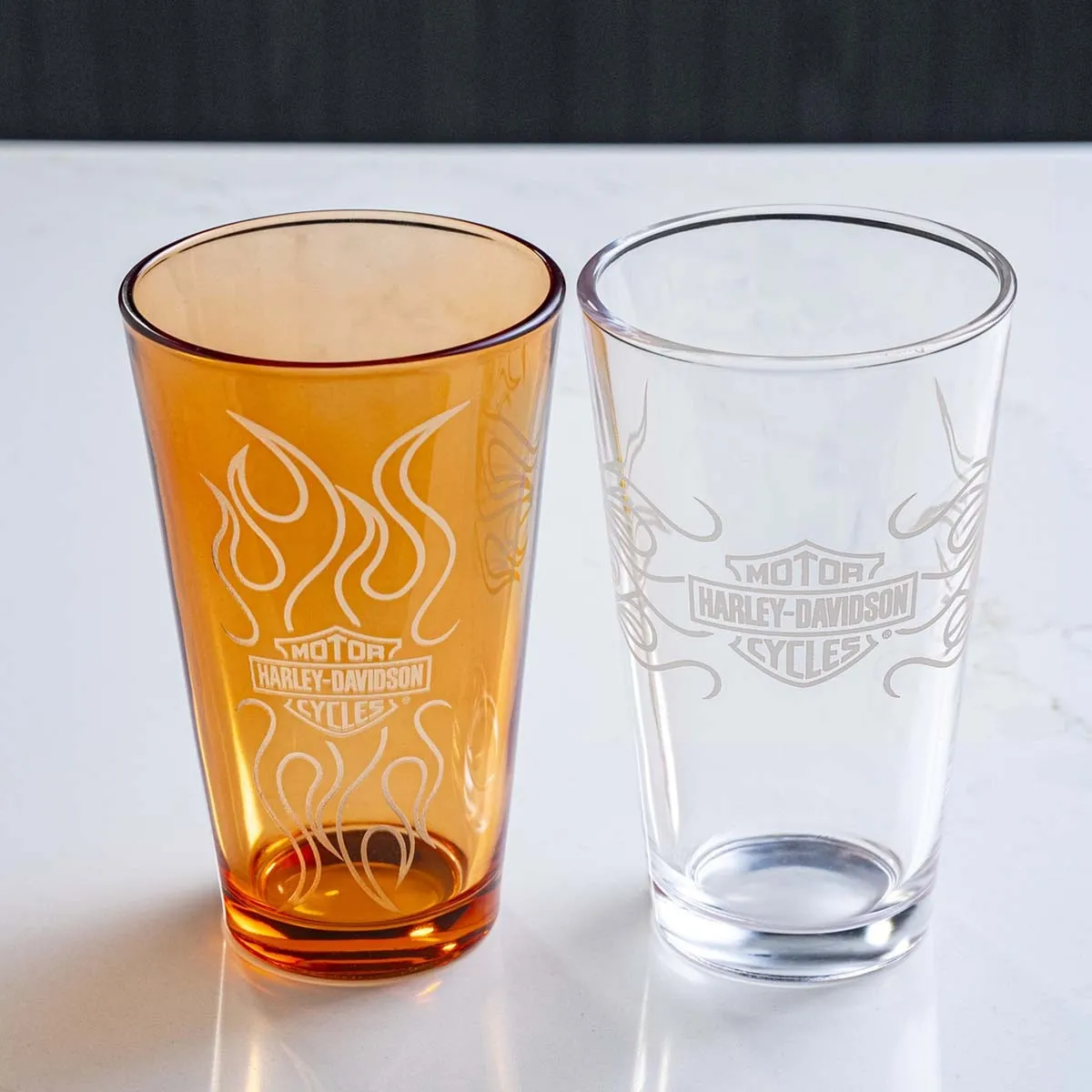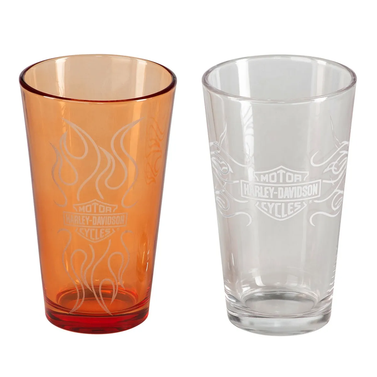 Set of two 16 oz. / 480 ml pint glasses includes one orange and one clear glass with faux etched Bar & Shield flames logos. Hand wash only.
