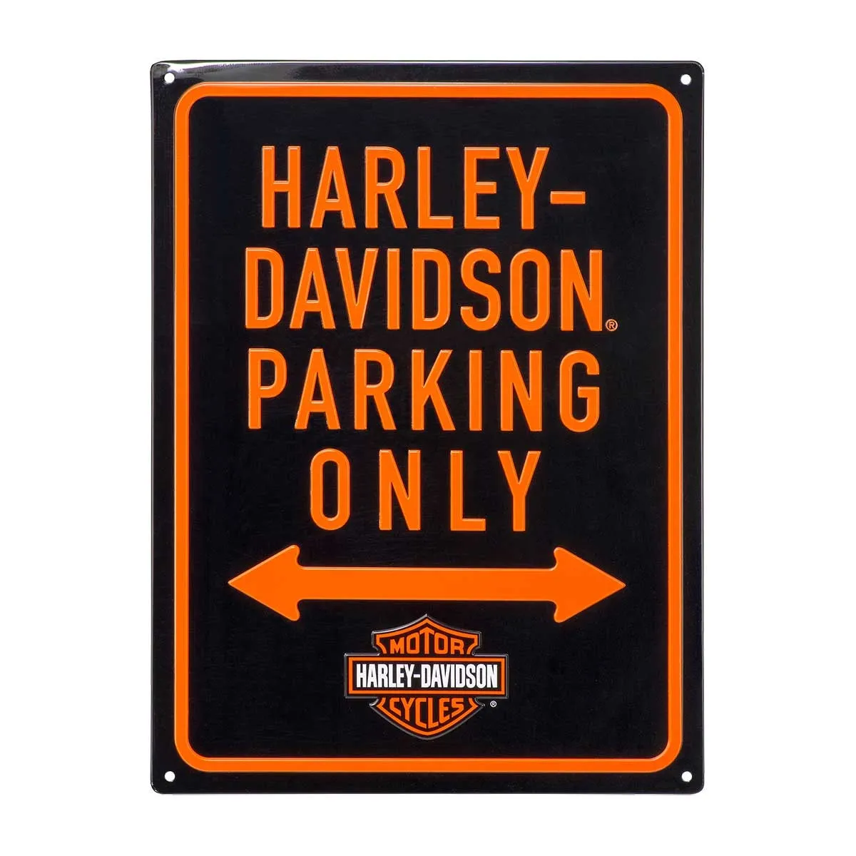 H-D Parking Only Tin Sign. Embossed accents and vibrant colors add depth and dimension. Smooth edges for safe handling. Includes holes for easy hanging.