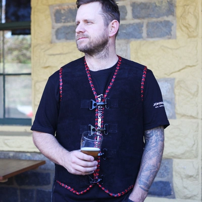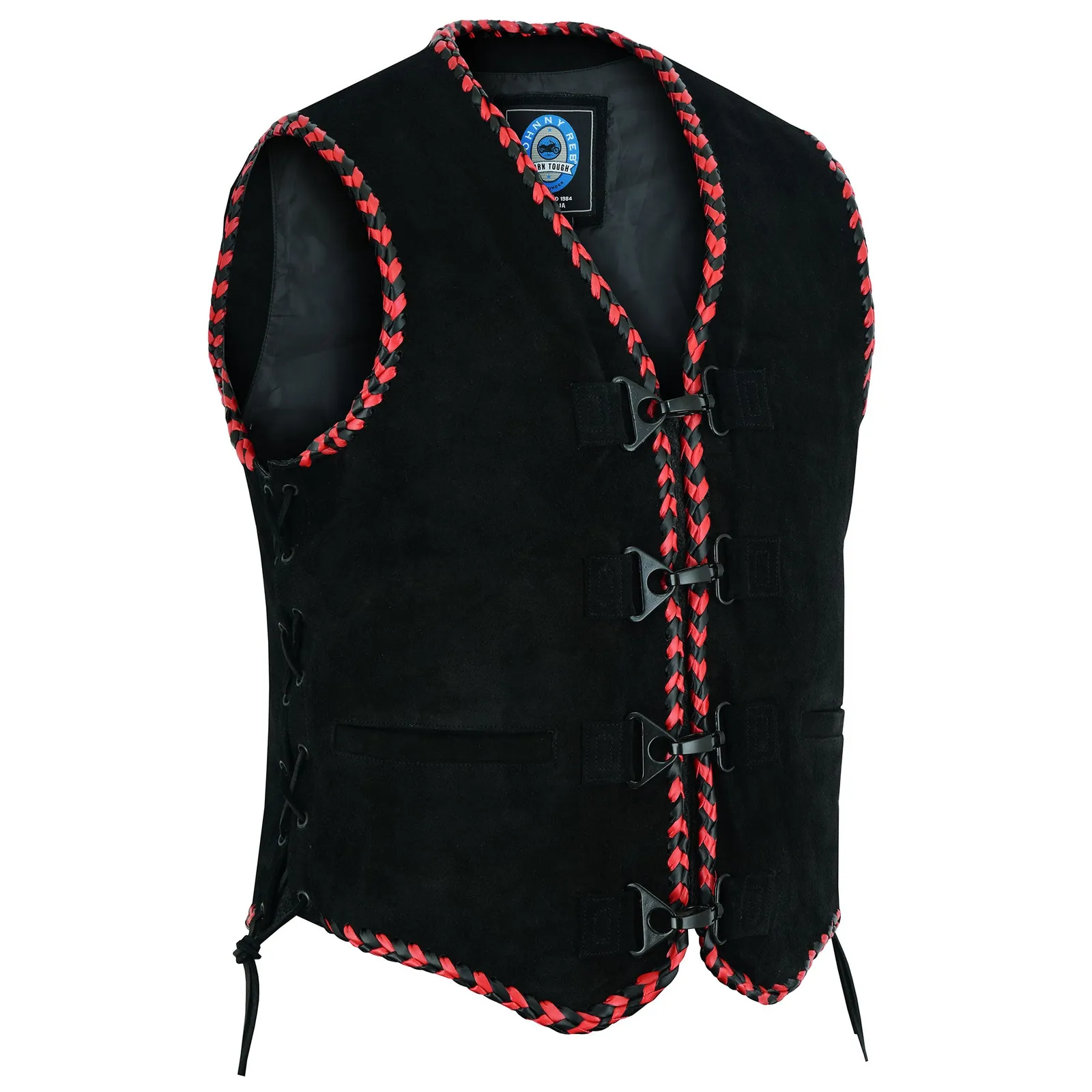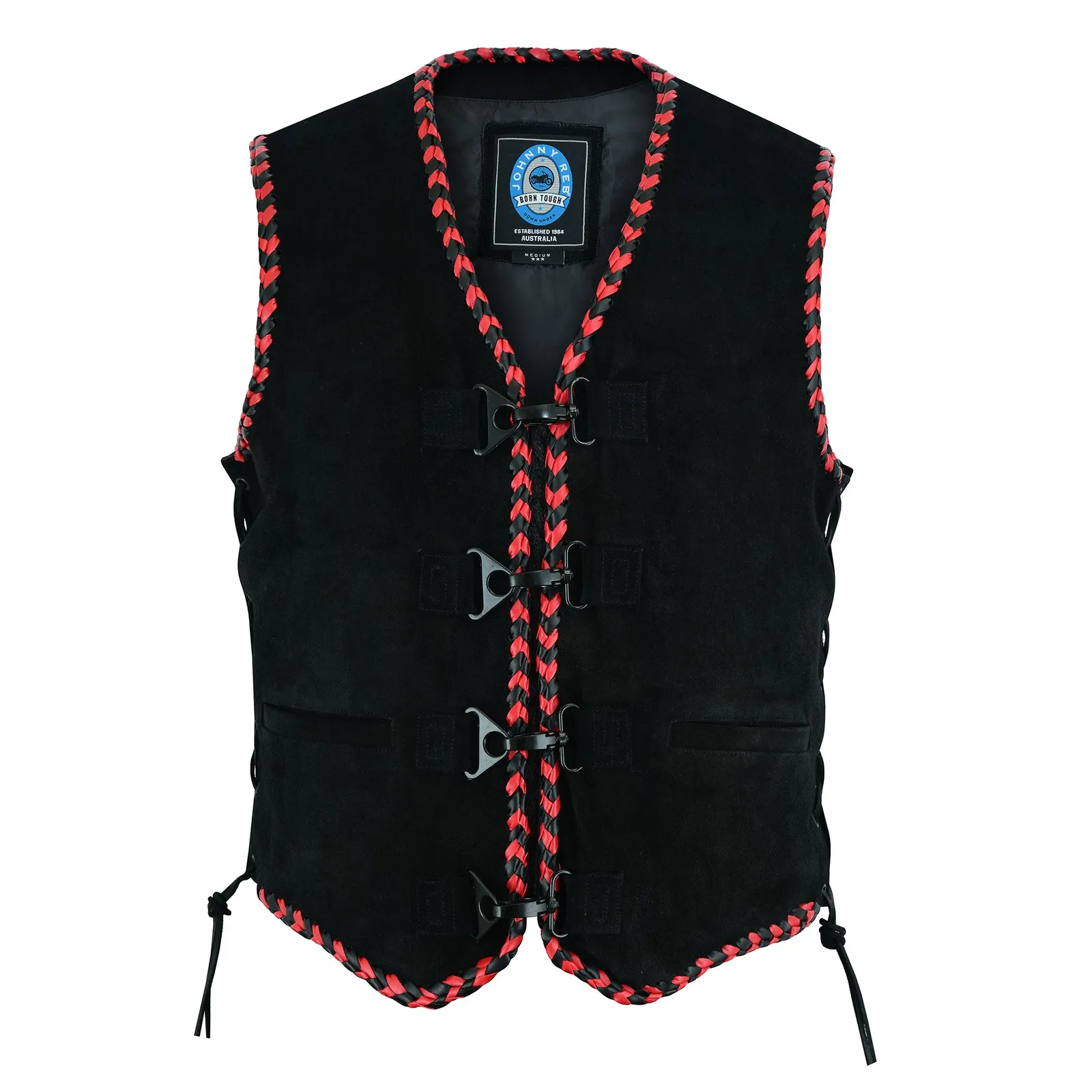 Lined with red & black leather braiding around all edges, the Men's Springbrook vest will make an impact! Made from high quality soft suede.