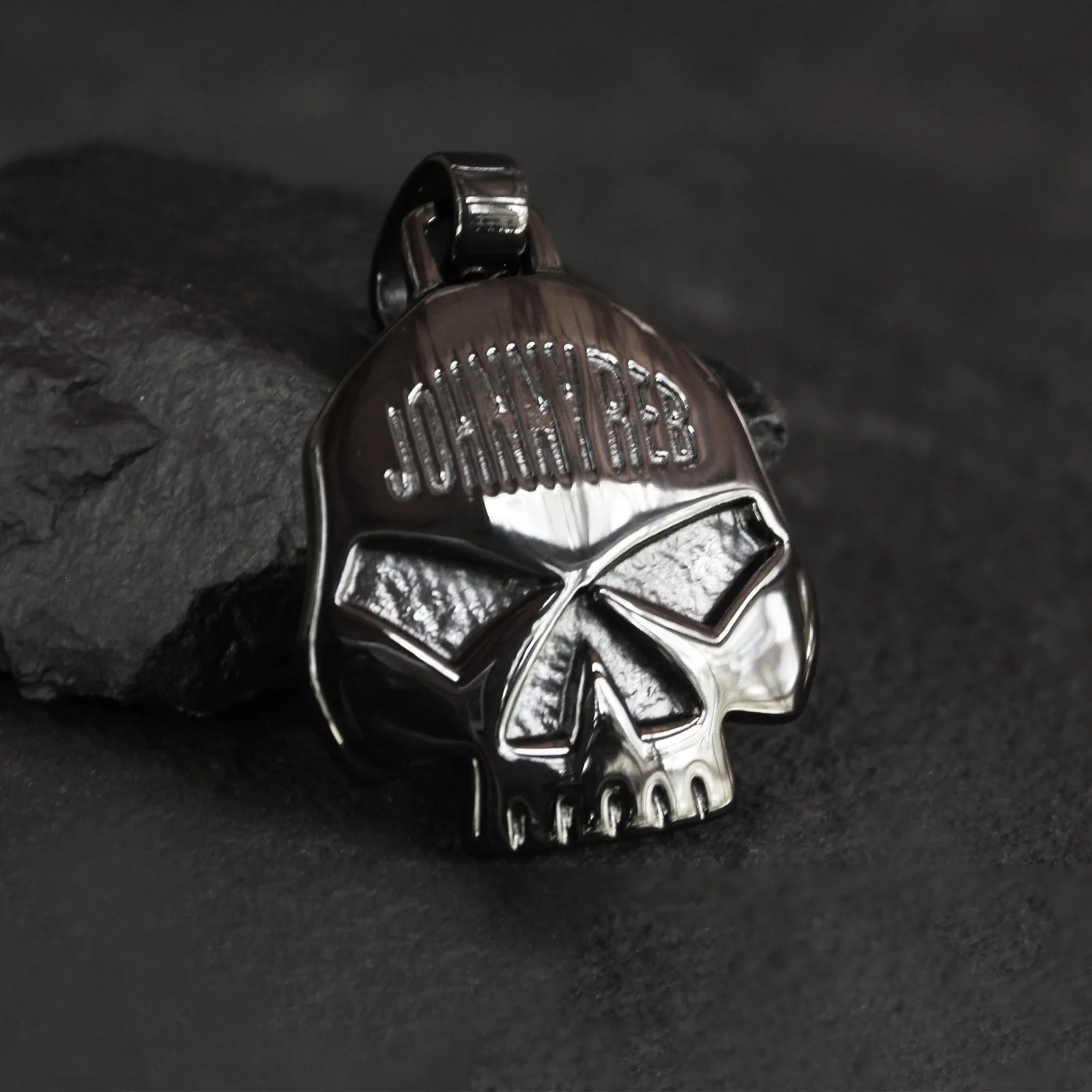 A black skull pendant stamped with iconic Johnny Reb engraving—built with attitude. A great addition to any black necklace.