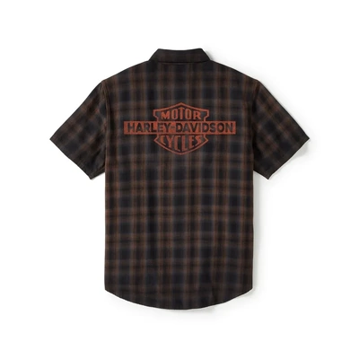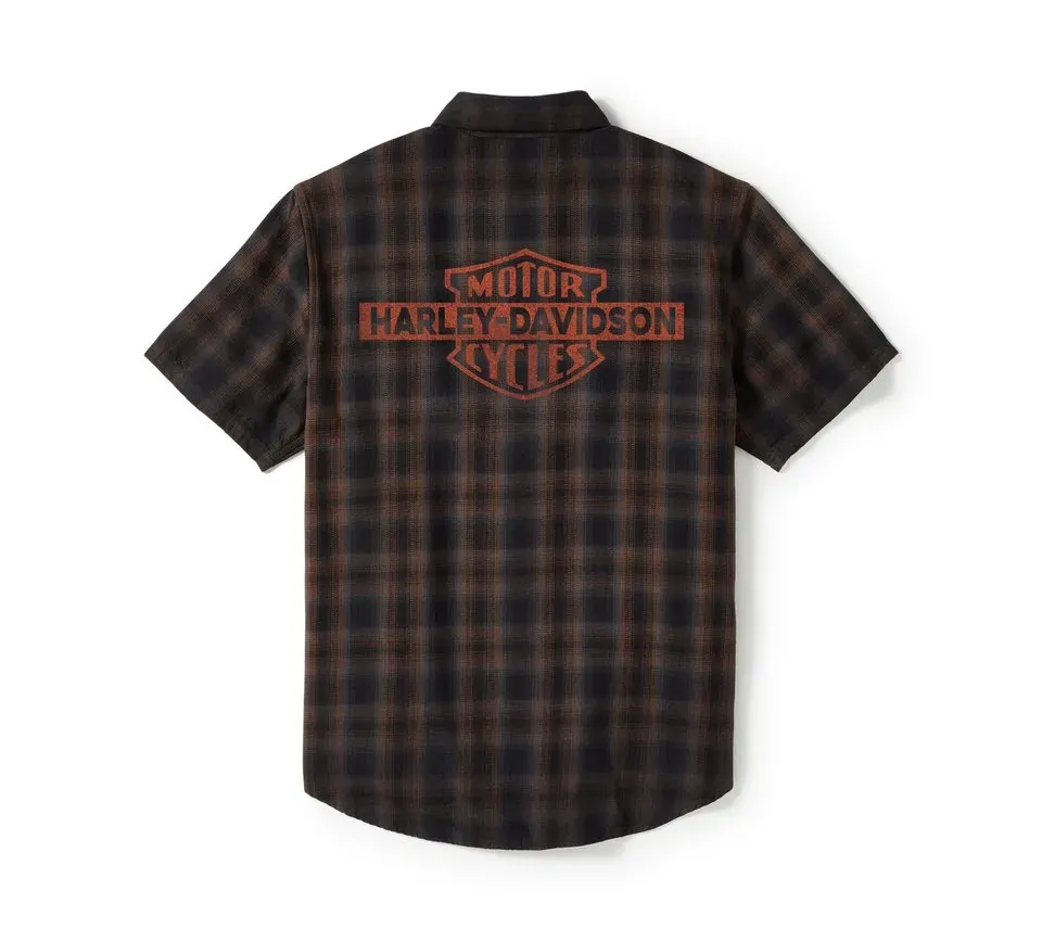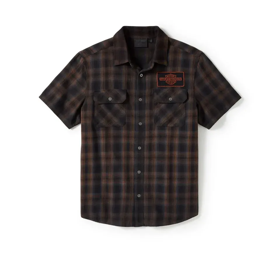 Classic moto style is here on our Bar & Shield Plaid Short Sleeve Shirt. Made for breathable comfort from all-cotton poplin that’s vintage washed for a well-worn vibe. This men’s button down features a pen stall and a hidden snap-down collar that stays put under riding gear. Finished with a replica of our 1930s Bar & Shield patched on front and printed on back.