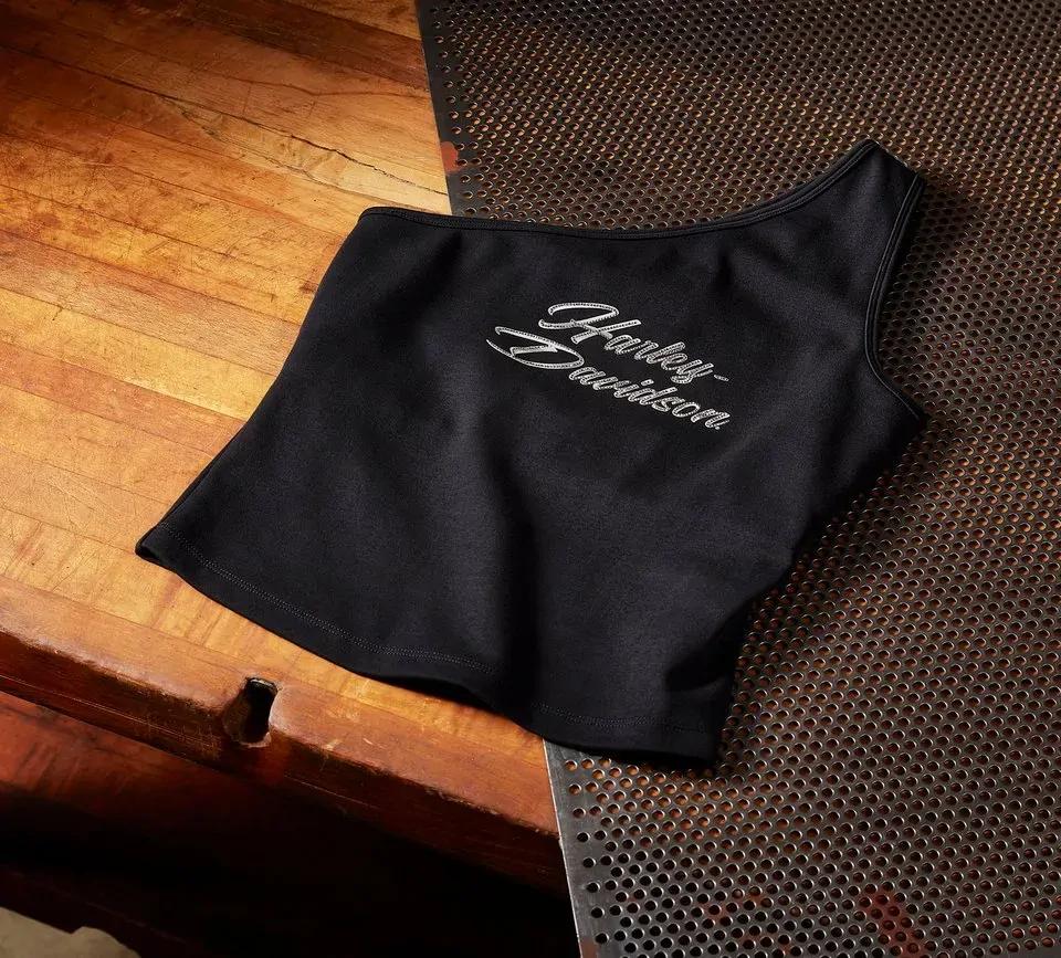 Add a kiss of shimmer to your figure-flattering look in our Essential Bling One Shoulder Top. Made for breathable, longwearing comfort from cotton interlock with a hit of spandex for added stretch. This womens top in a one-shoulder silhouette has a convenient inner bra for a more streamlined look. Its timeless style is stunningly finished with embellished H-D graphics.