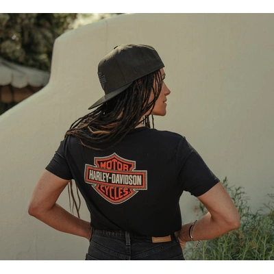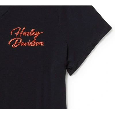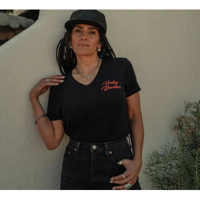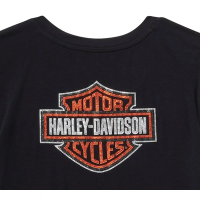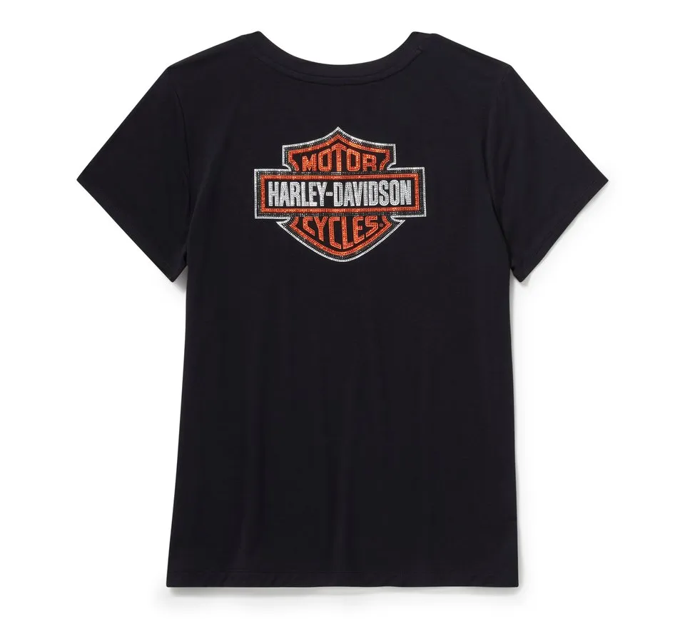 Level up your t-shirt situation with our Essential Bling V Neck Tee. Its rayon jersey build is super soft and lightweight, plus it has a hit of a spandex for added stretch. This womens short sleeve features a flattering mitered V-neckline and rhinestone-embellished graphics for a genuine Harley-Davidson look.