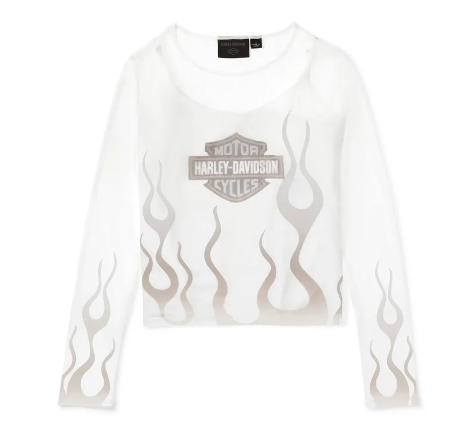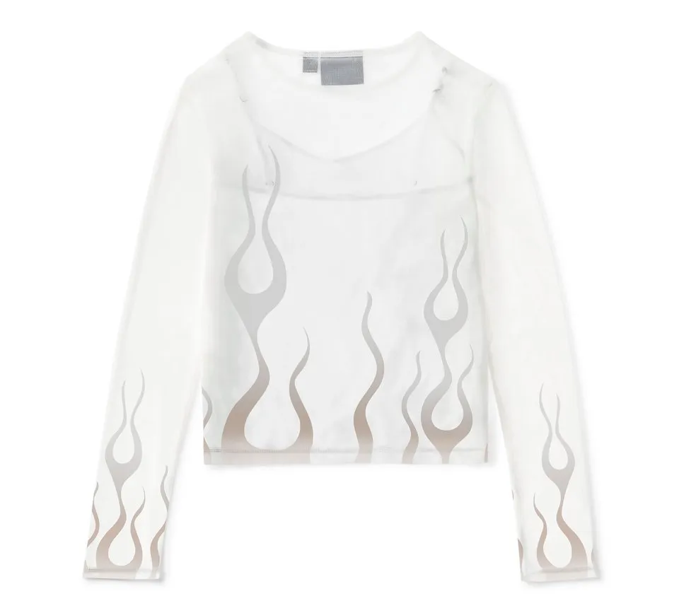 Looking hot is effortless in our Flames For Days Mesh Top. This two-piece set includes a fitted camisole with and a long sleeve overlay mesh tee. The sheer outer top is crafted from lightweight polyester mesh with a hit of spandex for added stretch. The removable polyester/cotton jersey camisole also has a hit of spandex for added stretch plus adjustable spaghetti straps. This women’s twofer defines standout style with its gradient flame graphics on the body and searing up the sleeves.